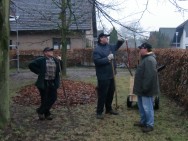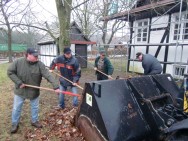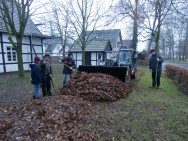 Schon ab Donnerstag ist das Laub mit entsprechenden Gerätschaften zusammengepustet worden, so dass die Helfer sich am Samstag in kleinere Gruppen aufteilten und die Laubhaufen auf die Anhänger verluden. Forken, Schaufeln und Schneeschieber wurden genauso benötigt wie Laubharken. Neben dem Aufladen fand sich immer wieder Zeit für kurzweilige Gespräche unter den fleißigen Helfern und dank des ausbleibenden Schnees blieb dem Team auch eine Zeitreise in den November erspart. | ||